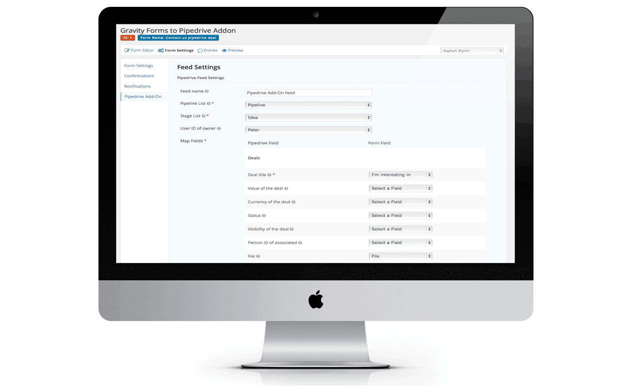Jos käytät Gravity Formsia WordPressissä ja Pipedrivea CRM-järjestelmänäsi, tämä lisäosa Gravity Formsille saa helposti ne kaksi toimimaan yhdessä! Yleisin käyttötapa on lisätä kyselylomake nettisivuillesi: kun vierailija täyttää lomakkeen, se lähetetään Pipedriveen, missä siitä luodaan kontakti ja diili. Voit jopa asettaa tehtävän muistuttamaan sinua seuraamaan kyselyä. Kaikki tämä tapahtuu automaattisesti. Enää sinun ei tarvitse manuaalisesti syöttää tietoja kaikista WordPress-sivun generoimista liideistä!