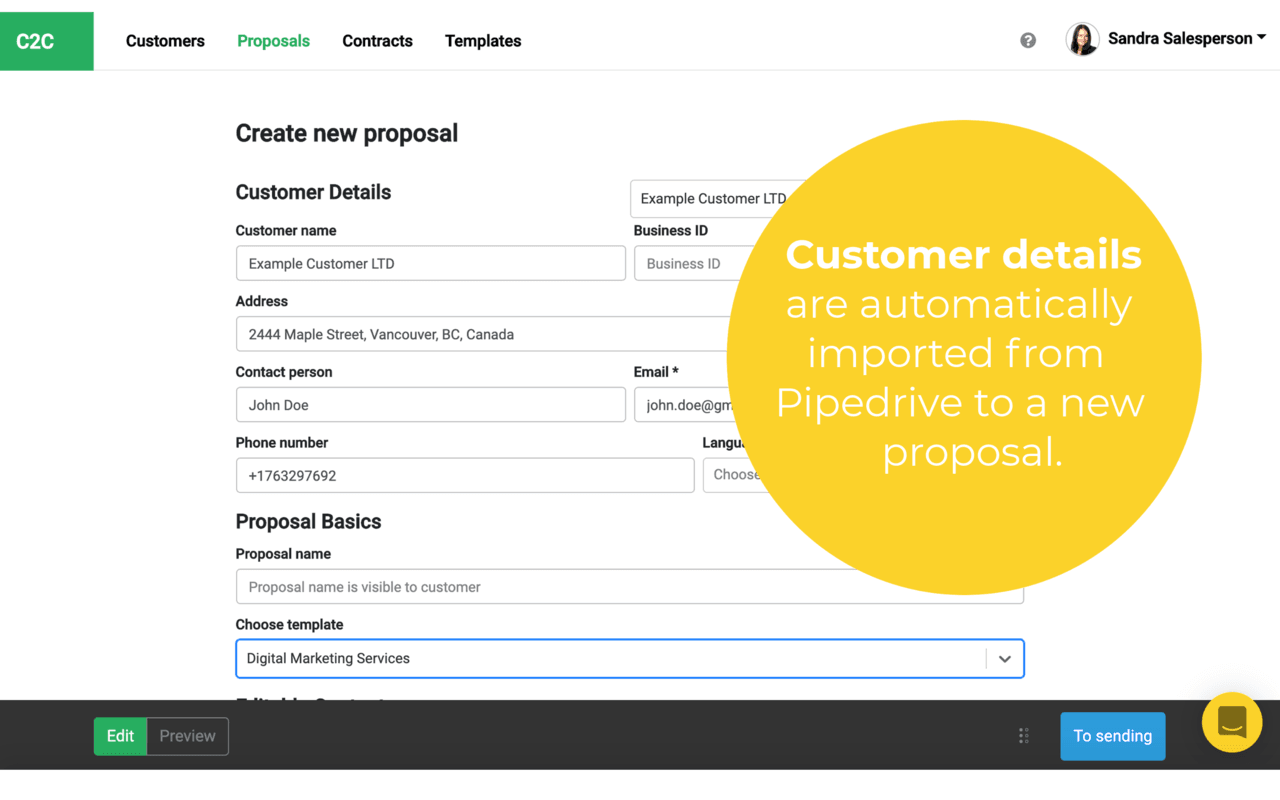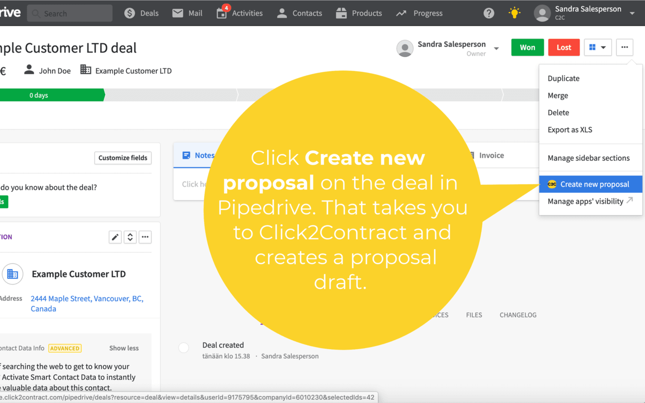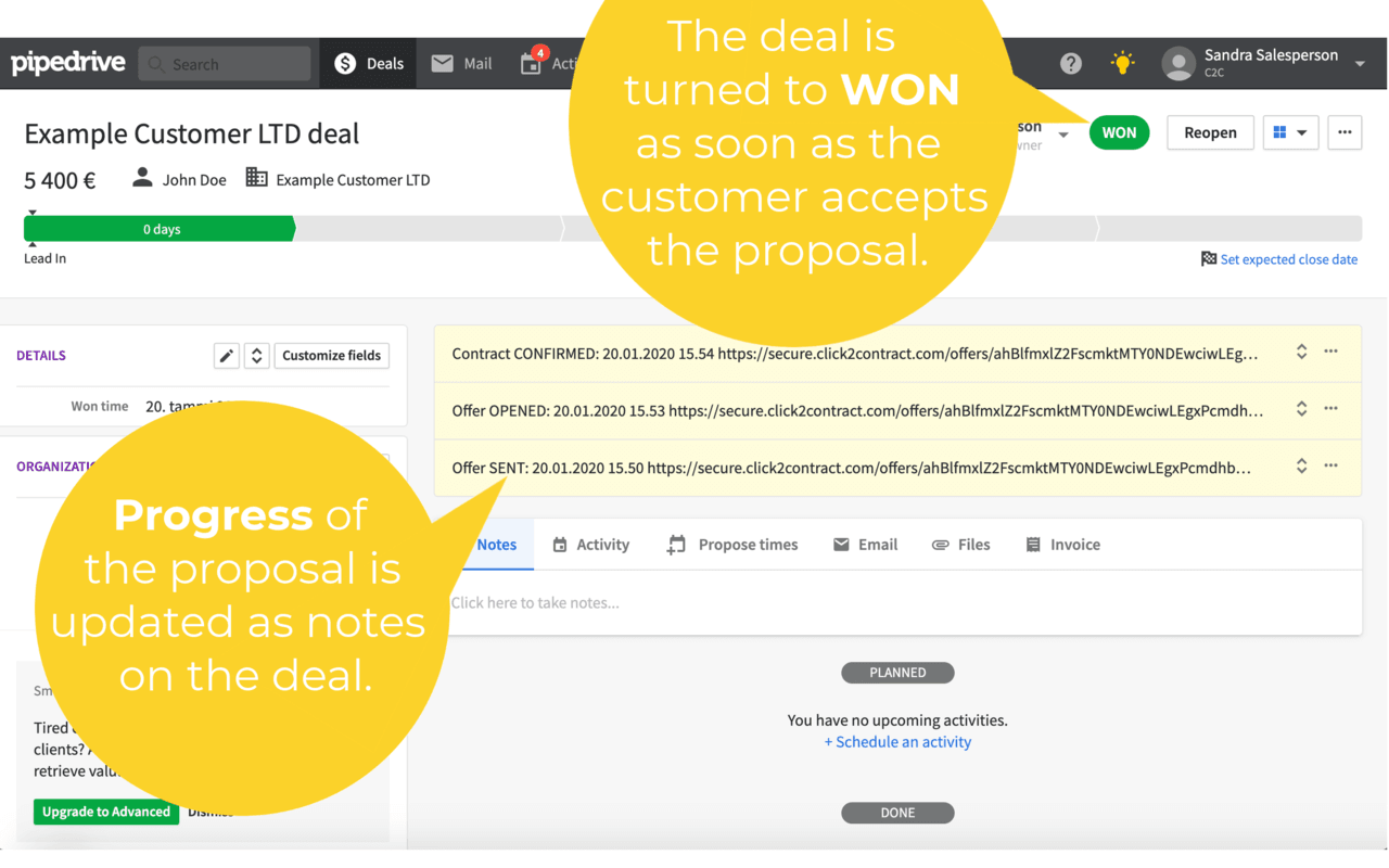 Lyhennä myyntisykliä mobiiliystävällisillä, visuaalisesti näyttävillä tarjouksilla sekä optimoidulla prosessilla Pipedrivesta tarjouksen kautta sähköiseen allekirjoitukseen ja sopimuksen arkistointiin. Kaikki tämä vaatii vain muutaman klikkauksen.